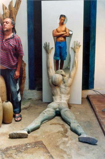 Amadasi com seu filho Piero, trabalhando na escultura "Violência Urbana", 2002